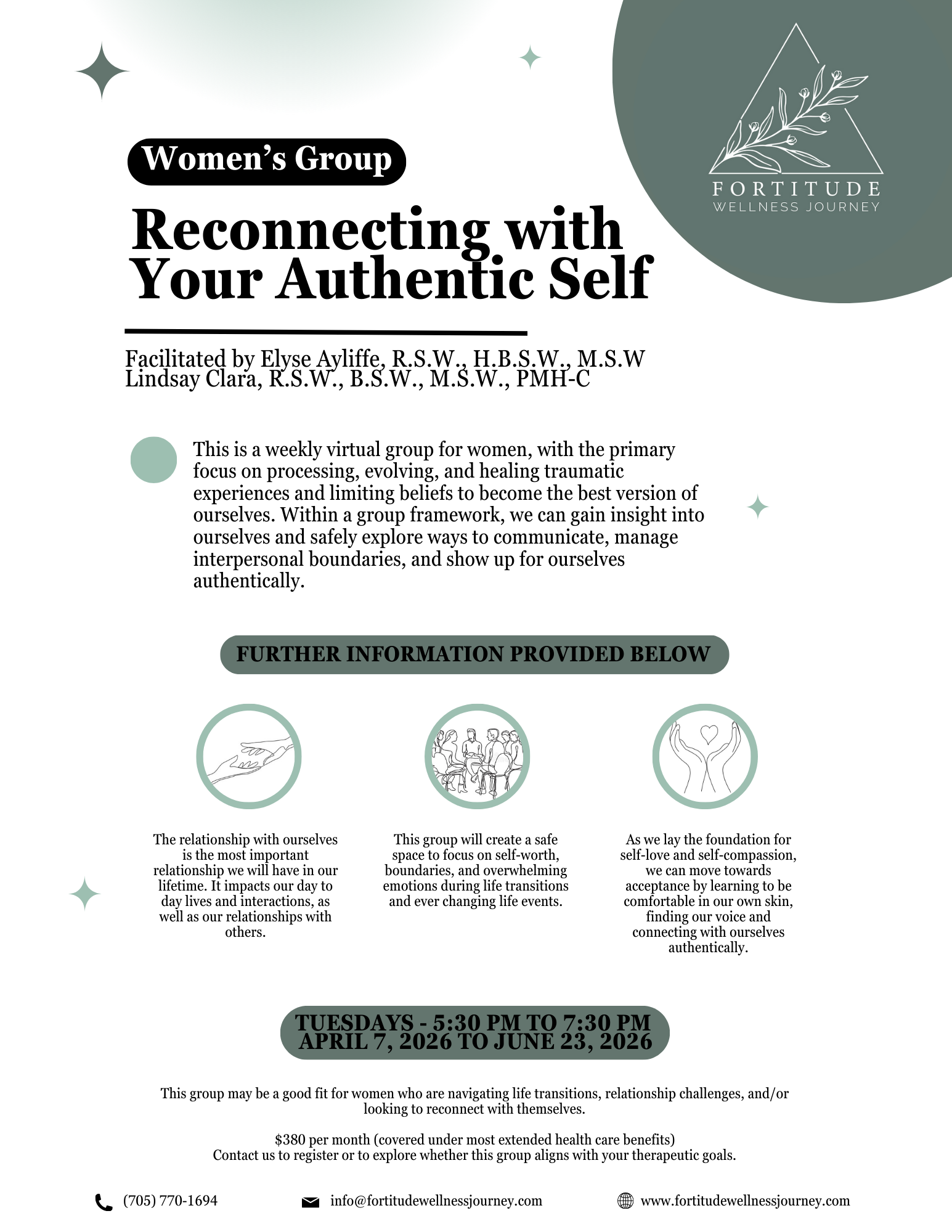 Our Reconnecting to Your Authentic Self women’s group provides a space for reflection, healing, and growth. Together, we explore self-worth, boundaries, interpersonal relationships, and navigating life’s transitions with greater compassion and authenticity.